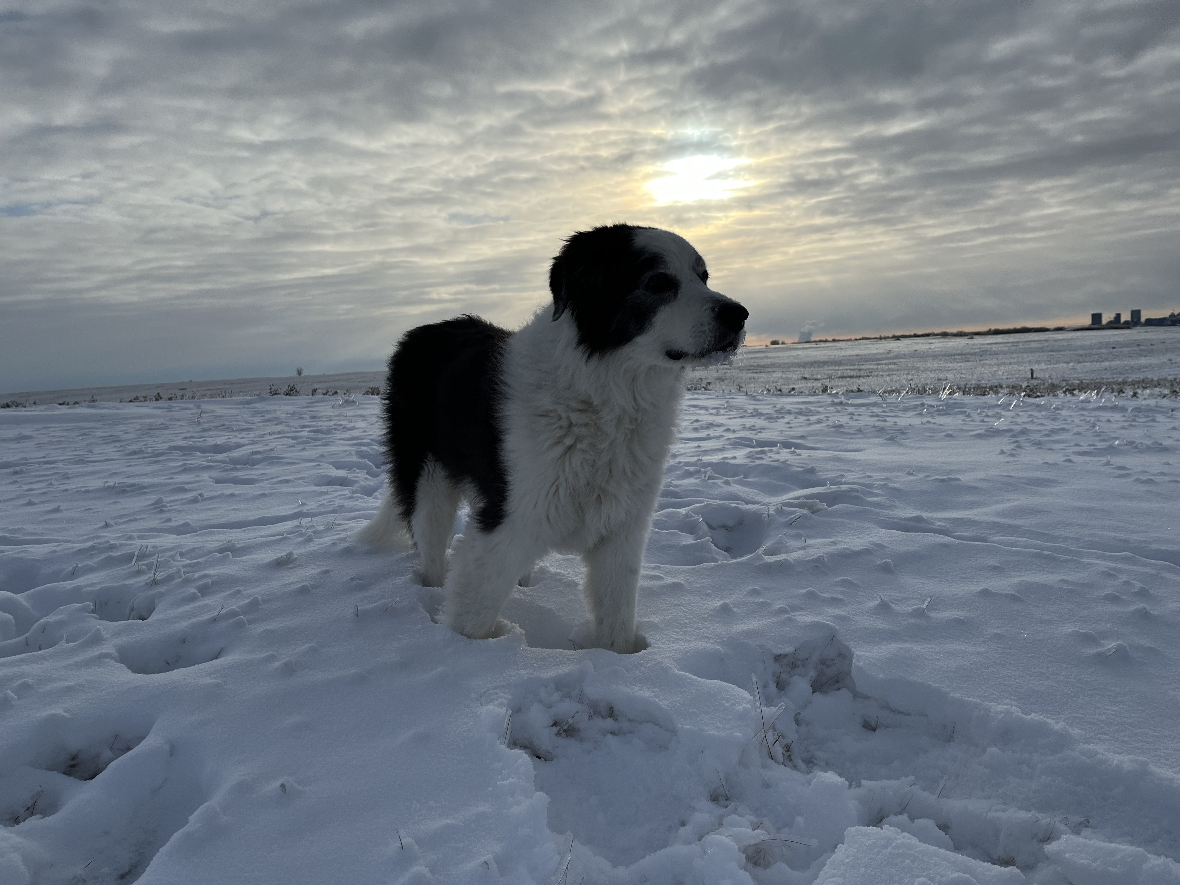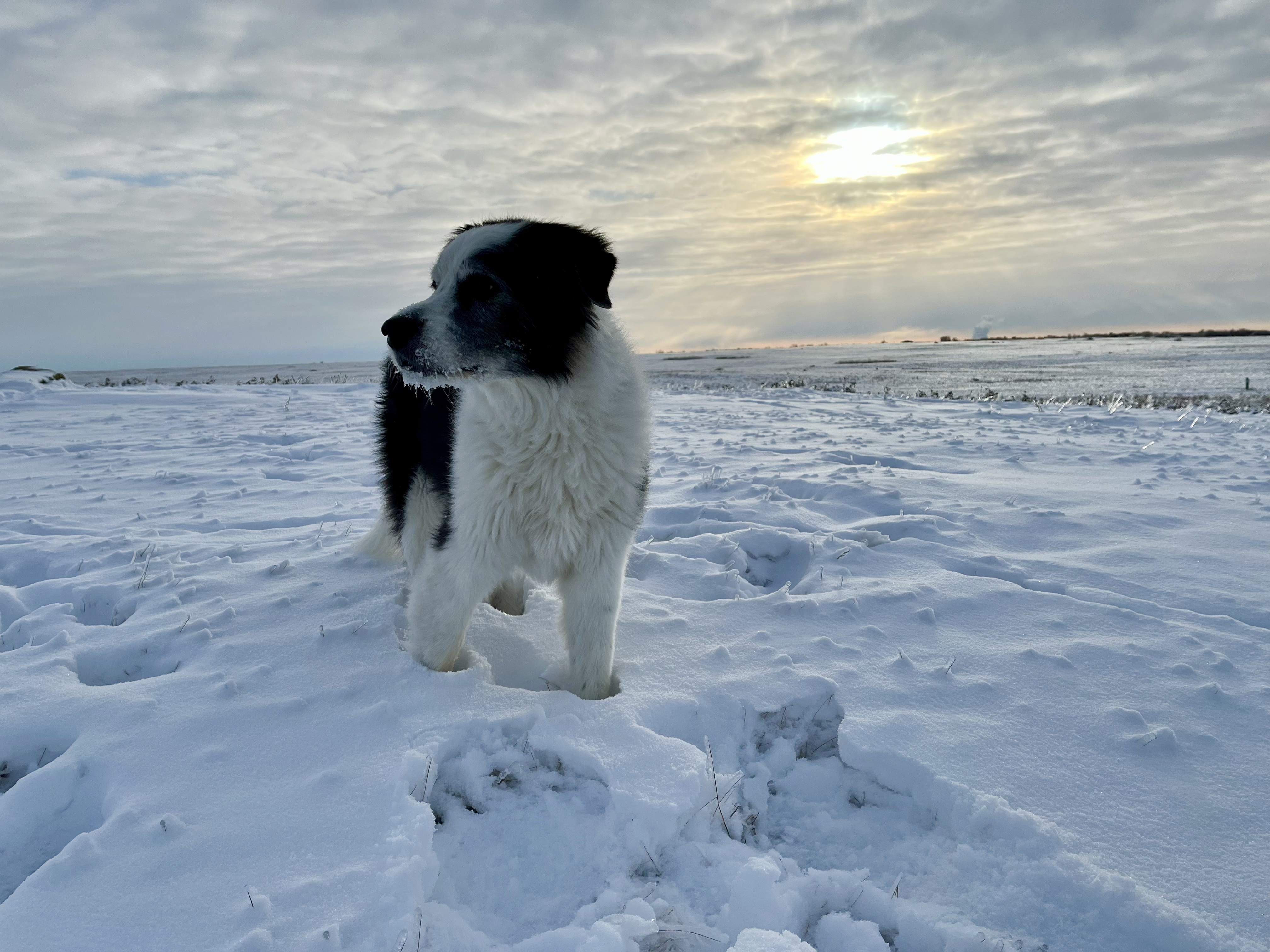 It is a great time of year, the light is always so beautiful. Zoey is a border collie cross, probably with Great Pyrenees. Her sister had one blue eye so she might also have Australian Shepherd or Husky.